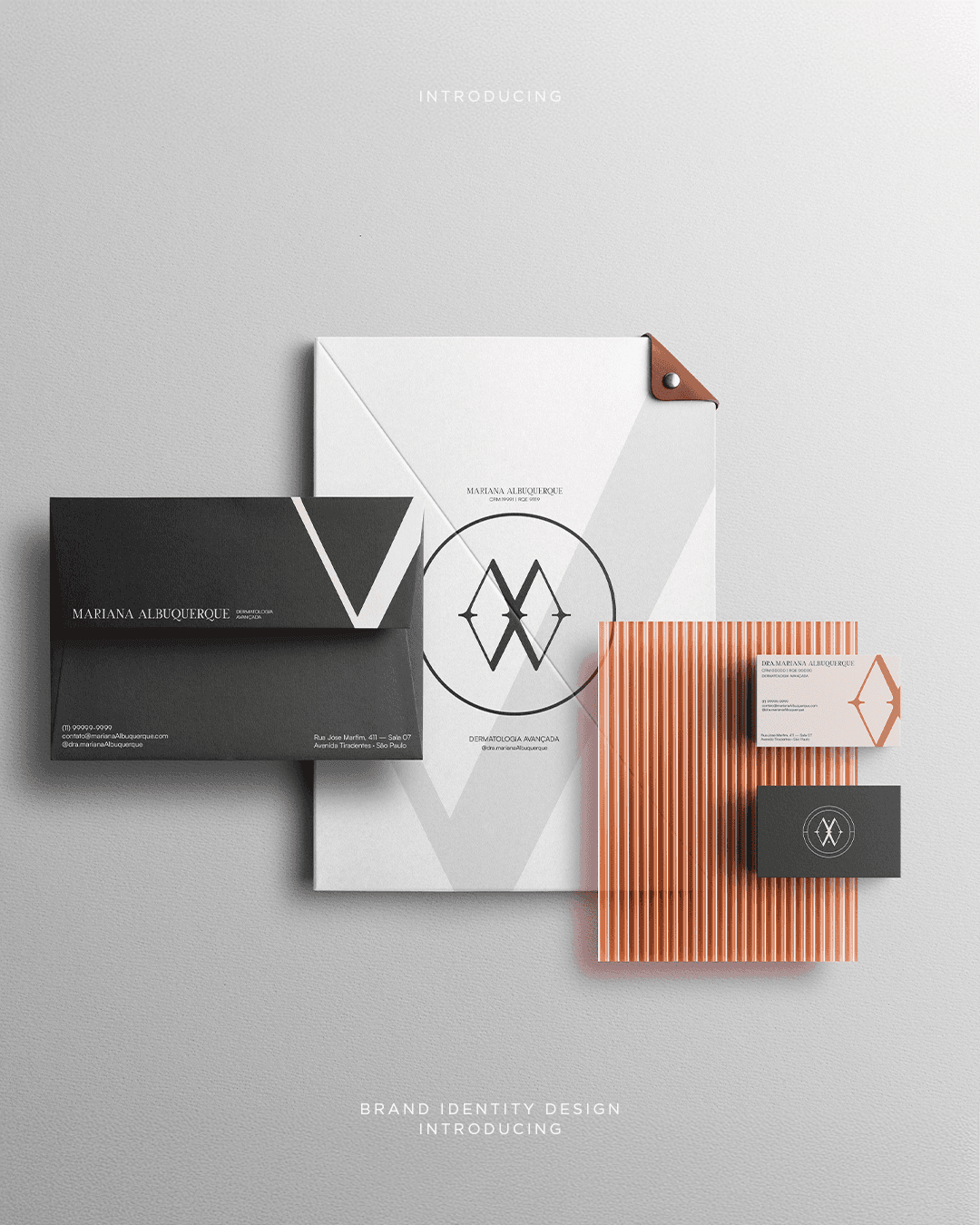 As cores da identidade visual da Dra. Mariana Albuquerque foram escolhidas para representar o que ela acredita: que toda pele merece cuidado. A paleta percorre os tons que a pele humana habita, do mais claro ao nude escuro, passando pelo terracota e ancorando no grafite profundo. Não é uma paleta de tendência, é uma paleta de pertencimento. Os tons fechados e quentes criam proximidade antes do primeiro contato, transmitem acolhimento sem perder sofisticação. É a sensação de entrar num lugar onde você já se sente cuidada.